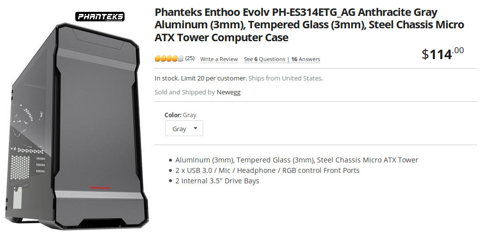 Case: Phanteks Enthoo Evolv Anthracite Gray Aluminum, Tempered Glass, Steel Chassis Micro ATX Tower